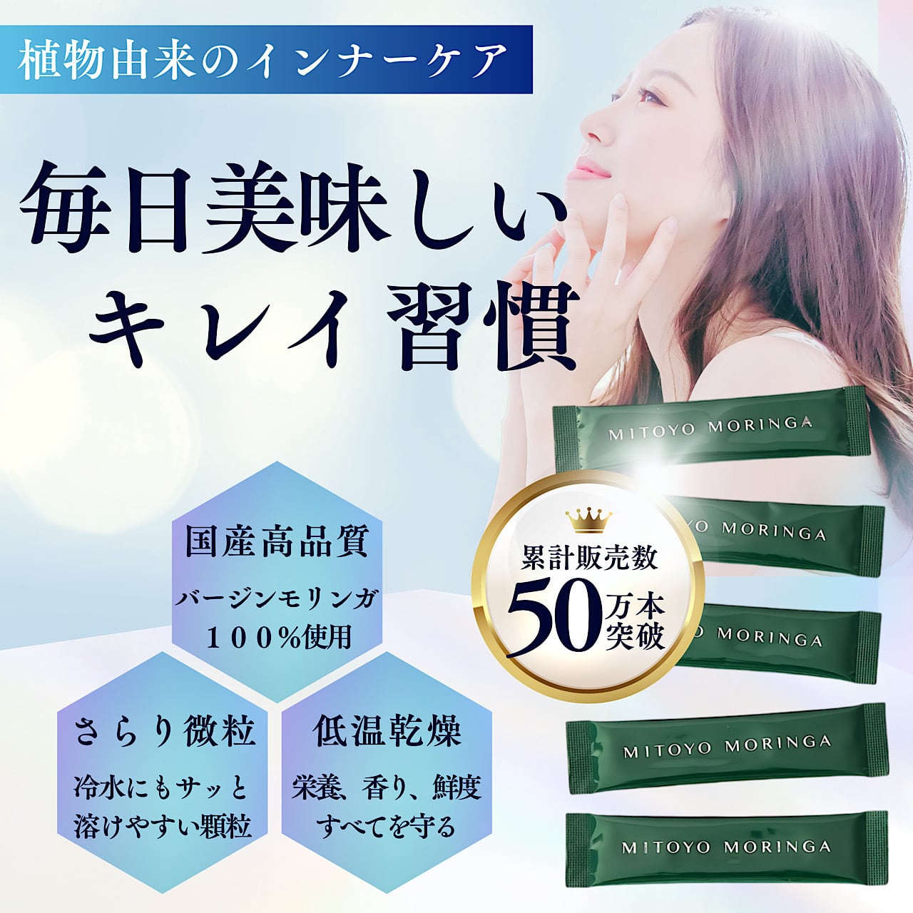 長時間低温乾燥により、未だかつてないモリンガ本来の美味しさや、濃緑の色合いを最大限に閉じ込めたスティックを、ぜひご賞味下さい。